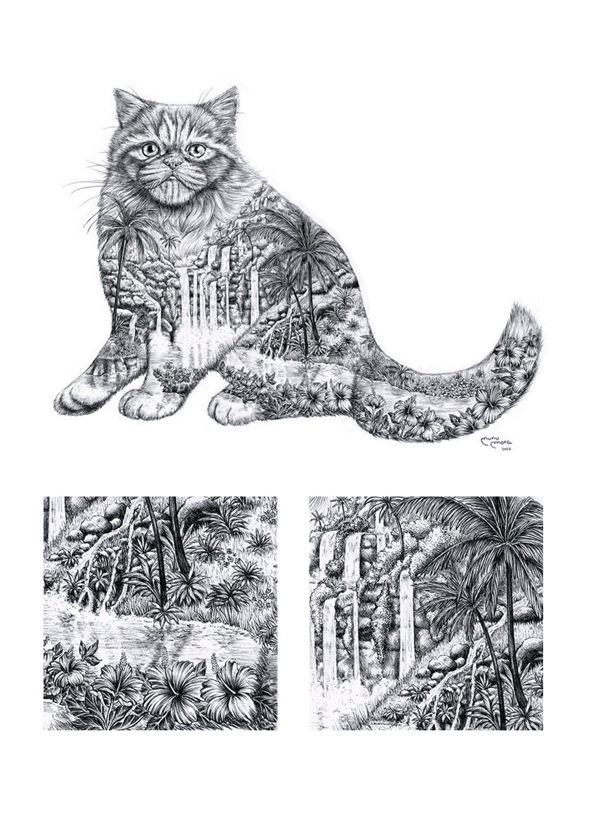 La ilustración está hecha con rotuladores calibrados sobre cartulina blanca de 300 gramos. Las puntas son de 0.03 y 0.05mm por lo que los dibujos adquieren una gran calidad en los detalles.